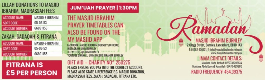 Imam Contact Detail: Maulana Hafiz Arshad: 07877 392865 Maulana A.Javvad Nasrullah: 07470 429980
